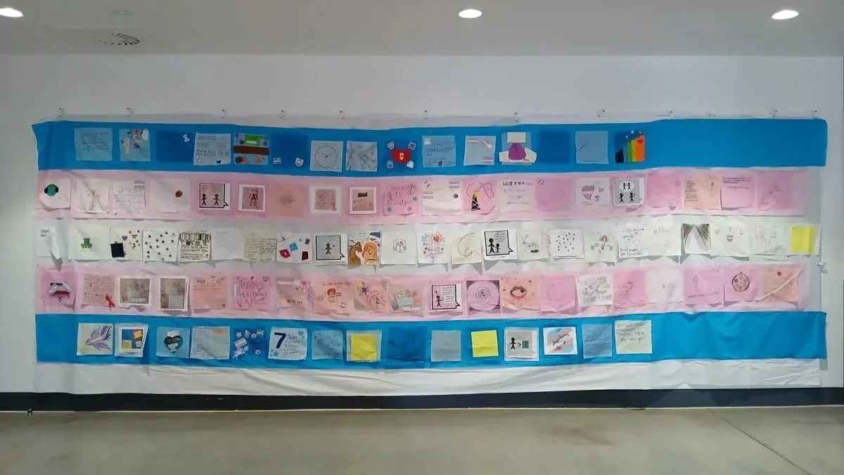 The fabric squares created at the workshops have been lovingly sewn together to form a large trans+ flag measuring 6m x 3m. The research team and allies worked together to sew it, with the final artwork unveiled at a Celebration Event on 31st March in Southampton. The plan is that the flag will tour art galleries, hospitals and other places where we can highlight the impact of the experiences.
